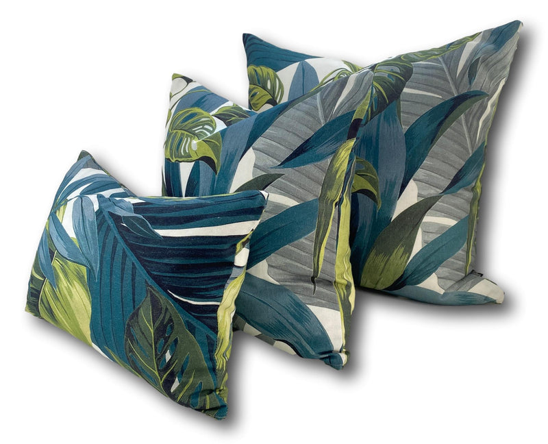 Aruba in Jungle is a tropical lush leaf design offering uplifting green and blue tones combined with a fresh white background - a beautiful colour palette - perfect for mood creation and resort style statement living, for the bedroom, lounge and living areas. Available in two luscious colourways. Midnight and Dew