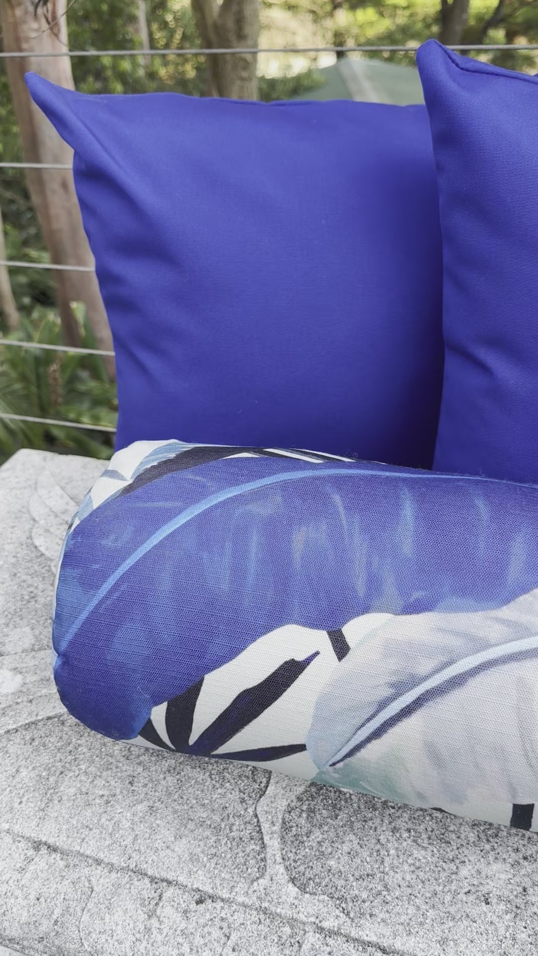Style Tru Blue on it's own or contrast with other bright cushions for maximum impact, consider reds and other bright blues, pictured here with Tulum Alfresco Red, Tropicalia Porcelain, Cove in Marine & Cairns in Marine.